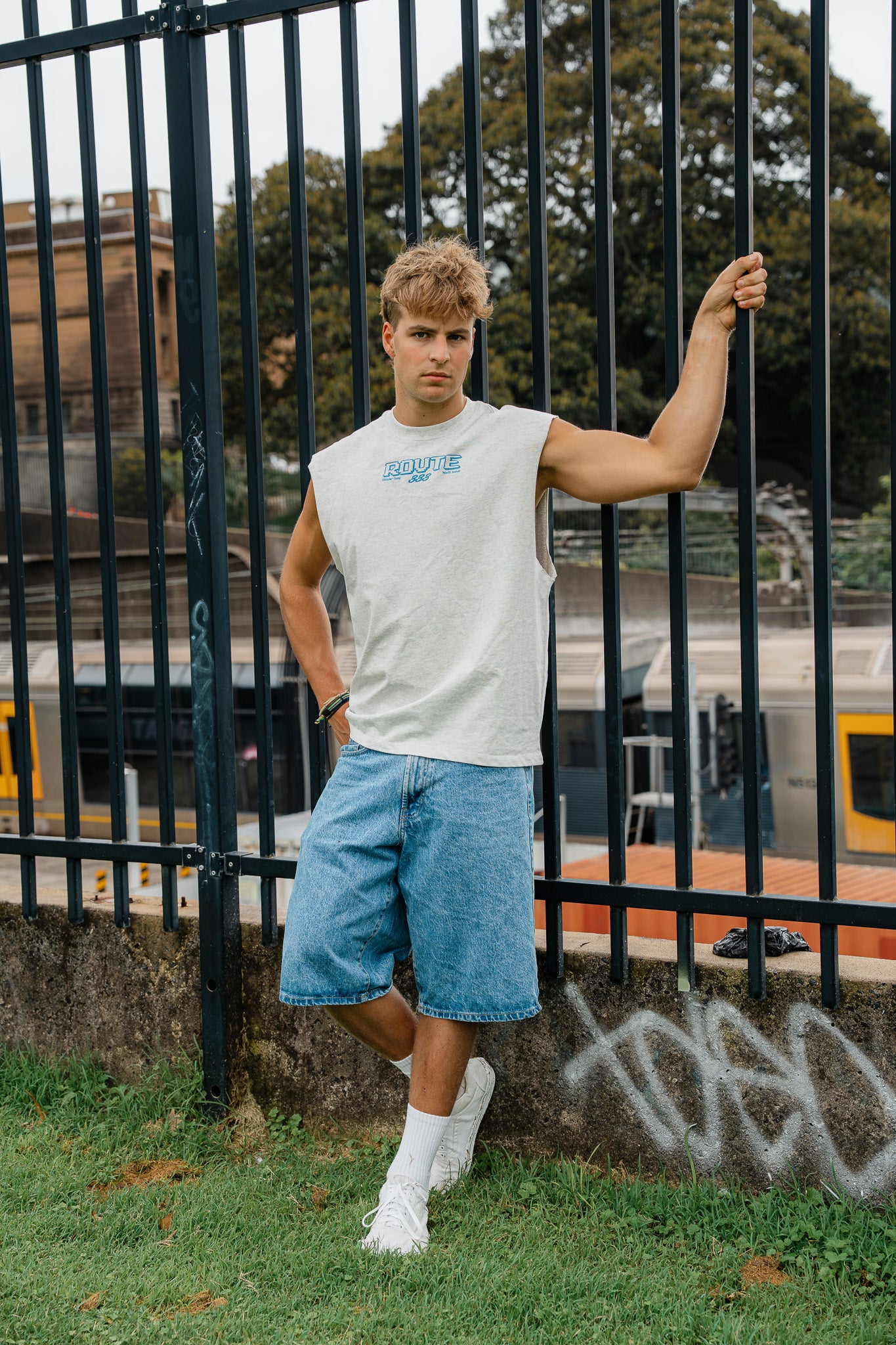 Man wearing a white t-shirt and blue shorts standing against a concrete wall.